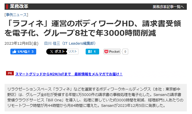 「ラフィネ」運営のボディワークHD、請求書受領を電子化、グループ8社で年3000時間削減 | IT Leaders