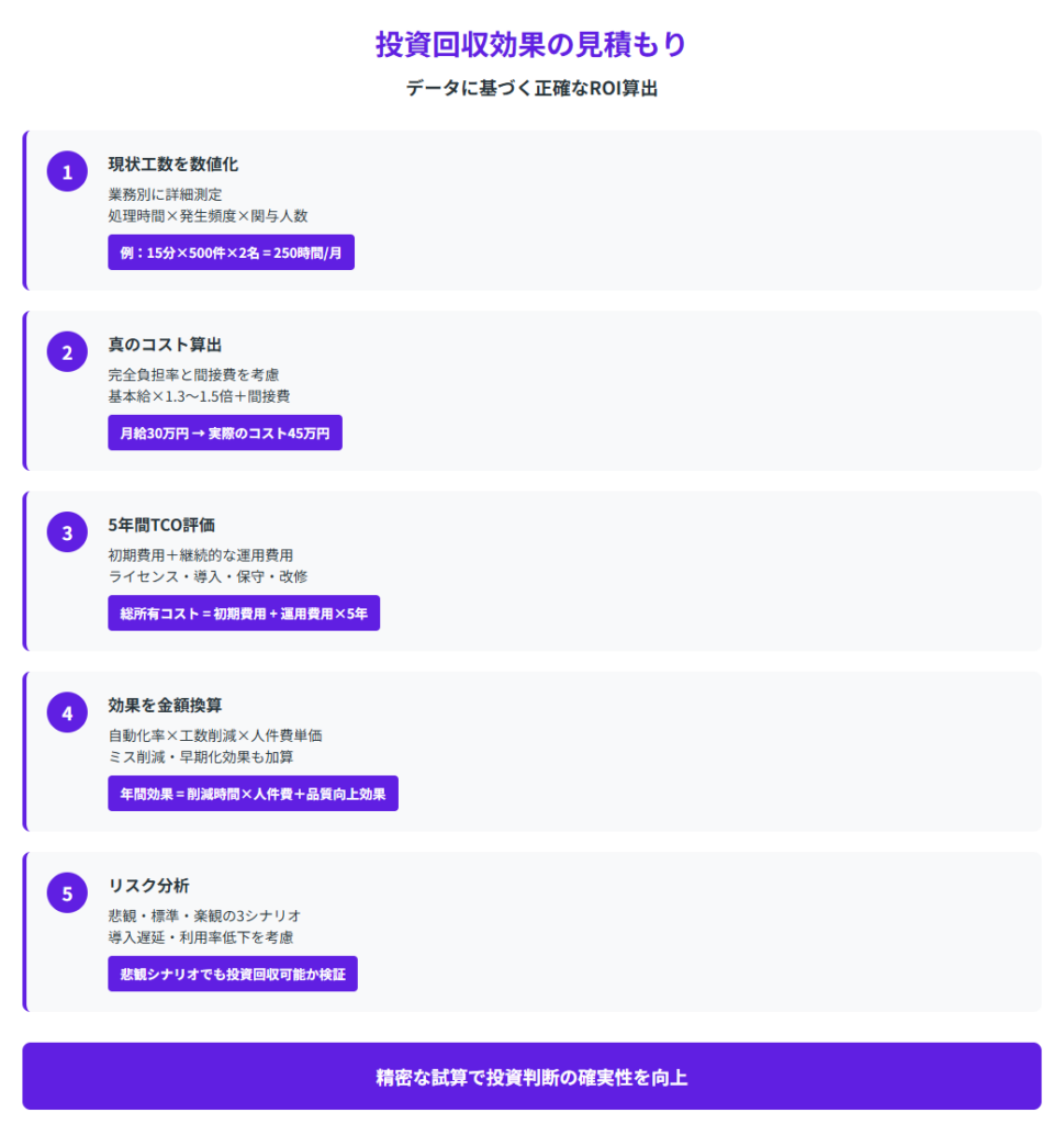 これらの効果を年間・5年間で累計し、割引現在価値で評価することで、投資対効果の妥当性を判断できます。