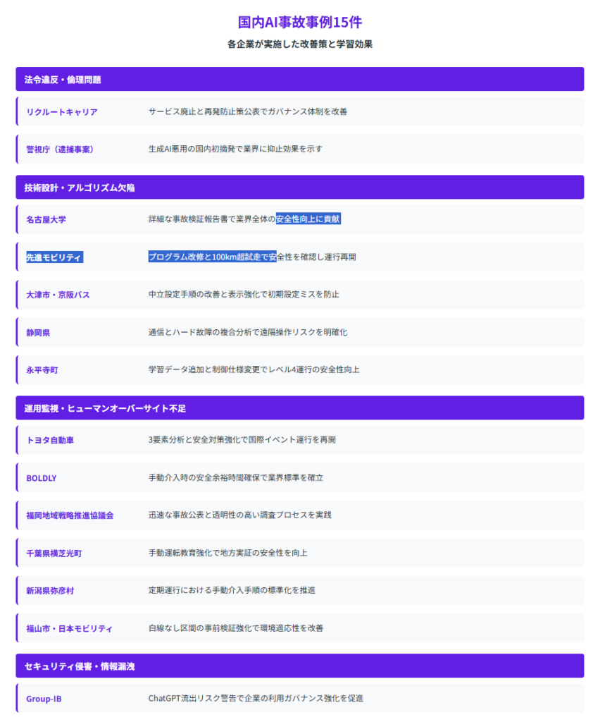 これらの事例を詳しく分析することで、AI導入時のリスクを事前に把握し、適切な対策を講じることが可能です。本記事では、公式情報に基づく日本国内のAI事故事例14件を分類し、それぞれの原因と対策を詳しく解説します。企業のAI導入担当者や経営層の方々にとって、リスク評価と予防策立案の参考資料としてご活用いただけます。