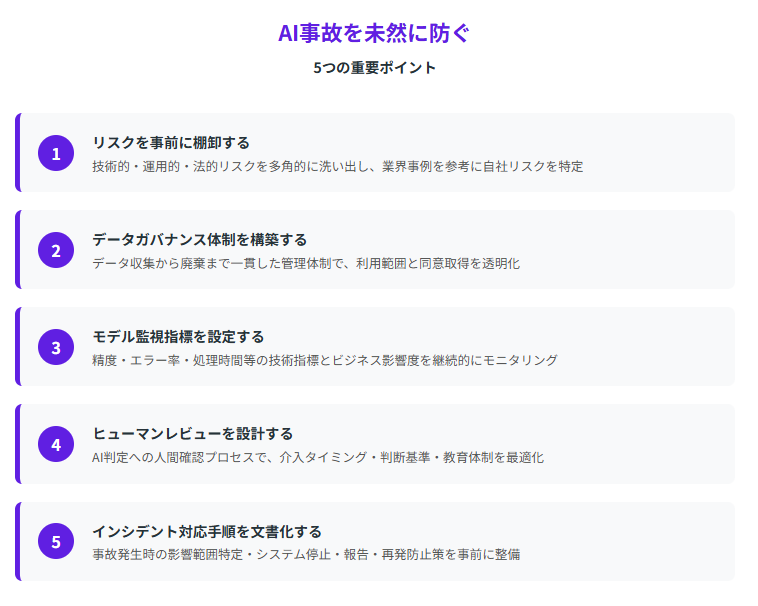 以下の5つのポイントを実践することで、多くのAI事故を未然に防ぐことができます。