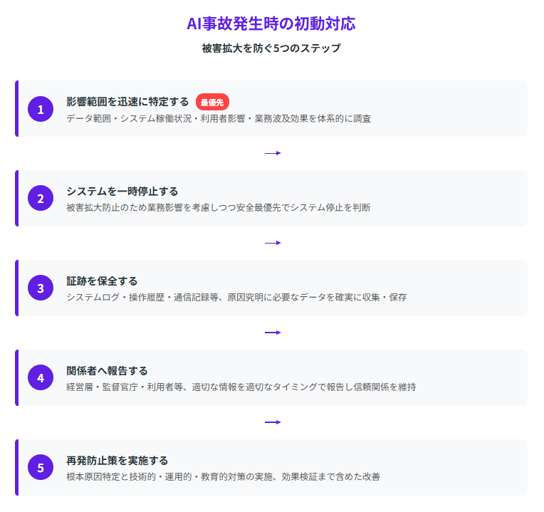 AI事故が発生した際の初動対応は、被害の拡大防止と早期復旧において決定的な重要性を持ちます。適切な初動対応により、二次被害を防ぎ、ステークホルダーからの信頼維持を図ることができます。以下の5つのステップを順序立てて実行することが重要です。
