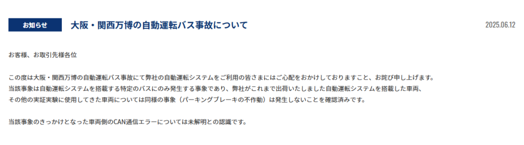 先進モビリティとOsaka Metroは、事故後の対応において高い透明性を示しています。特定車両に限定された設定ミスであることを公式検証で明確に切り分け、プログラム改修後に100km超の試走を実施。さらに、運行再開時にはサポート要員の同乗など、安全体制の強化策も公表しました。