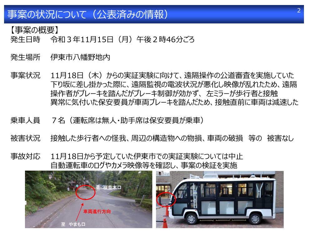 • 静岡県の遠隔操作自動運転バス歩行者接触事案