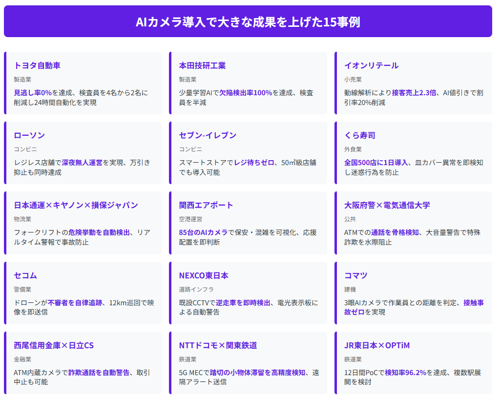 本記事では、日本企業が実際にAIカメラを導入して大きな成果を上げた15の事例を、「業務効率化」「顧客体験向上」「安全・セキュリティ強化」「DX展開」の4つの軸で整理してご紹介。導入背景から具体的な成果、使用技術まで詳しく解説しますので、AIカメラ導入を検討される方の参考となれば幸いです。