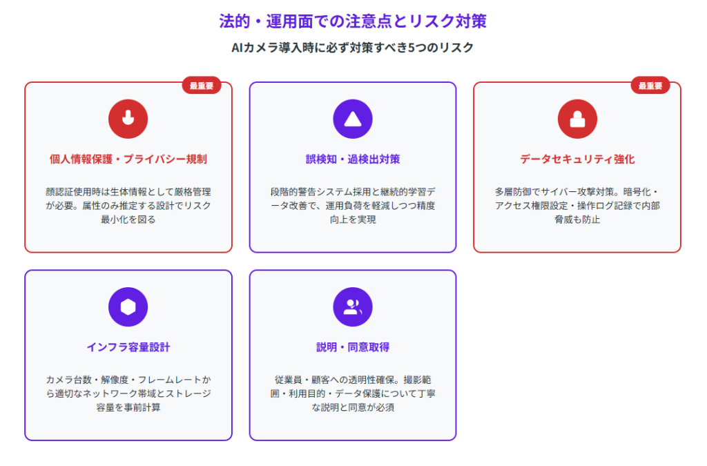 AIカメラ導入時には、技術面だけでなく法的な規制や運用上のリスクへの対策が不可欠です。事前に適切な準備を行うことで、トラブルを未然に防げます。