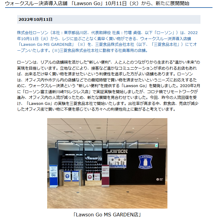 ウォークスルー決済導入店舗 「Lawson Go」10月11日(火)から、新たに展開開始|ローソン公式サイト