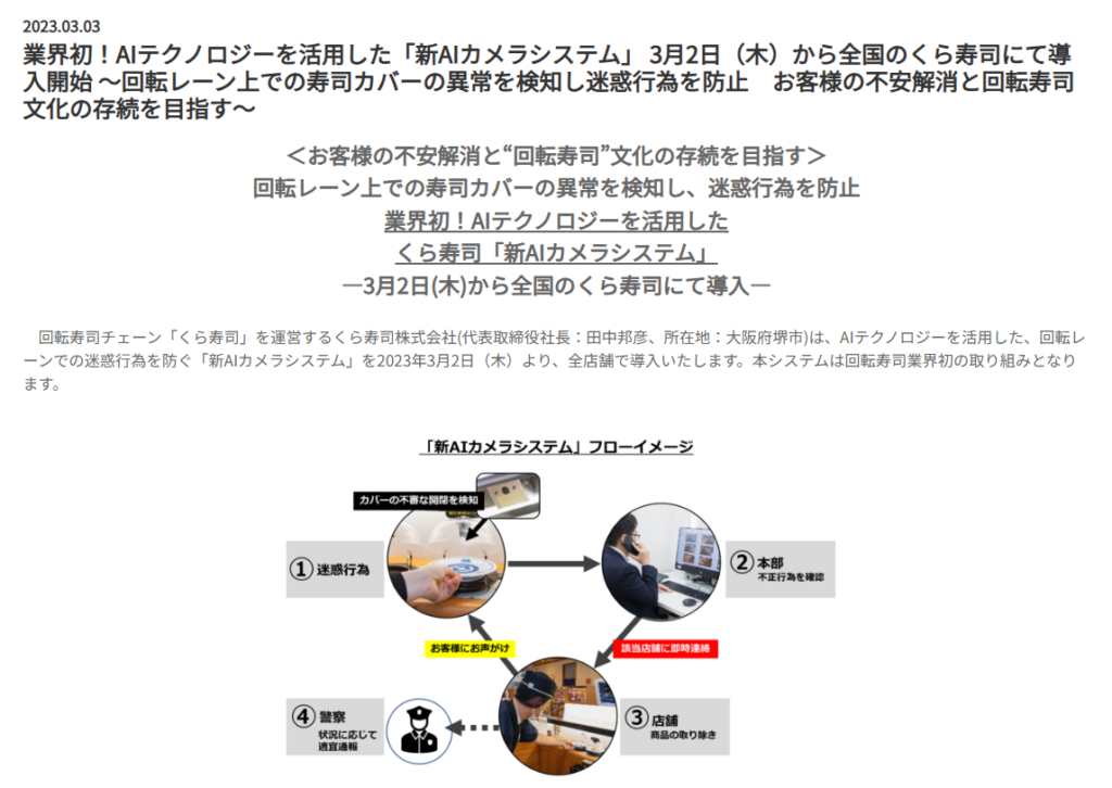 同社は既存の皿カウント用カメラをソフトウェア拡張により転用し、寿司カバーの異常開閉を自動検知するAIシステムを構築。異常を検知すると即座に本部にアラートが送信され、店舗スタッフが該当商品の撤去と顧客への声掛けを行う仕組みを整備しました。全国約500店舗への導入をわずか1日で完了させた迅速性も話題となっています。