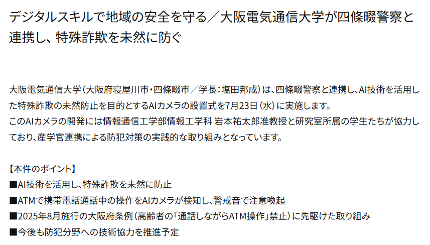 - 大阪府警×電気通信大学がATM詐欺を水際で阻止した事例