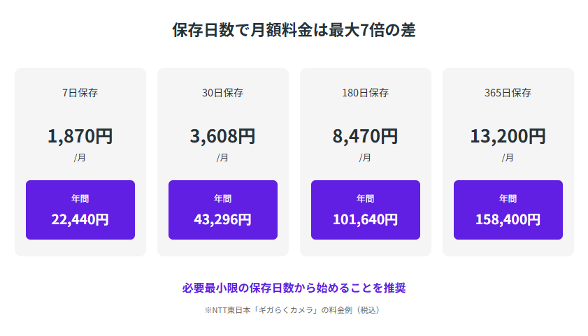 クラウド型AIカメラの月額料金は、映像の保存日数によって大きく変わります。NTT東日本の「ギガらくカメラ」の料金表を見ると、以下のような価格帯が提示されています。