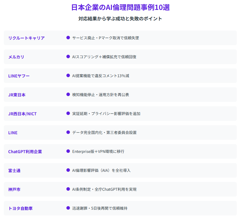 本記事では、日本企業で実際に発生したAI倫理的問題の事例を10件取り上げ、「AIバイアス是正」「プライバシー侵害対応」「倫理ガイドライン策定」「説明責任強化」の4つの軸で整理しました。各事例から学べる教訓と対策を通じて、企業がAIを安全かつ倫理的に活用するためのヒントをお届けします。
