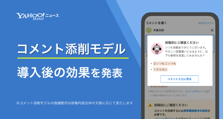 【Yahoo!ニュース】投稿内容の表現の見直しを提案するAI「コメント添削モデル」導入後の効果を発表 | LINEヤフー株式会社のプレスリリース