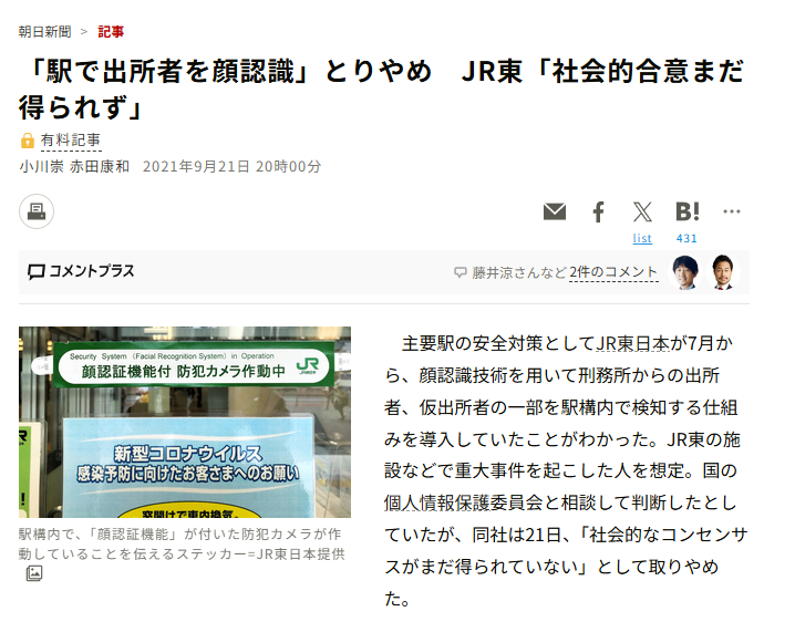 「駅で出所者を顔認識」とりやめ JR東「社会的合意まだ得られず」:朝日新聞