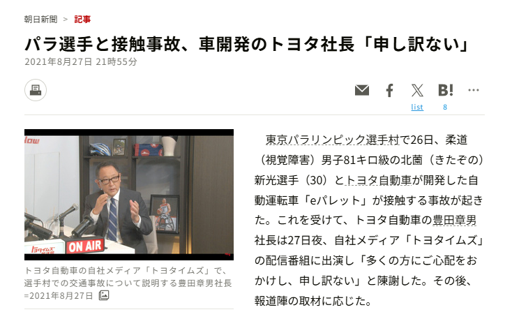 パラ選手と接触事故、車開発のトヨタ社長「申し訳ない」:朝日新聞