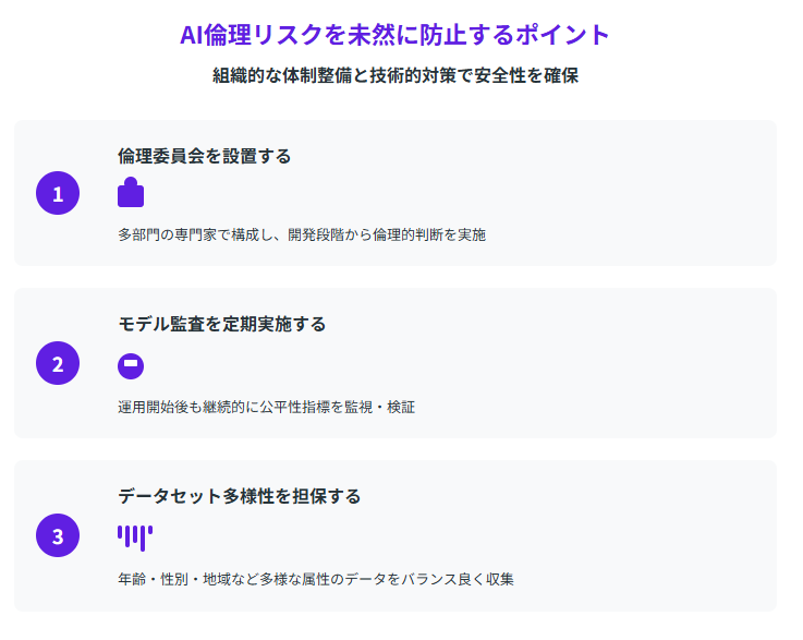 AI倫理問題を事前に防ぐためには、組織的な体制整備と技術的な対策の両面から取り組む必要があります。以下の3つのポイントを実践することで、リスクを大幅に軽減できます。