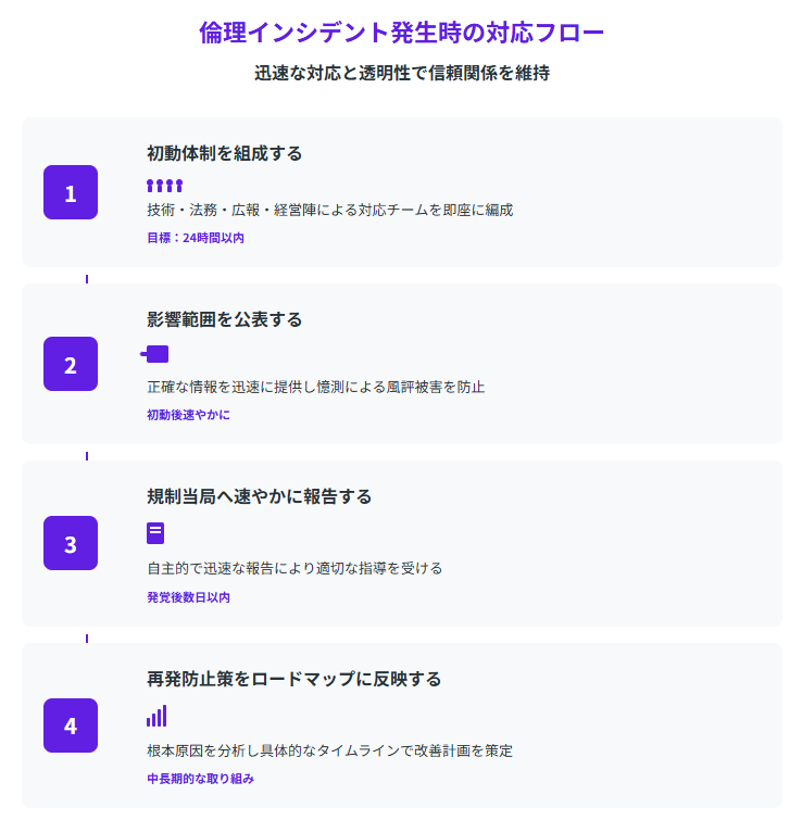 AI倫理問題が発生した際の対応スピードと透明性は、企業の信頼回復に直結します。適切な対応フローを事前に整備しておくことで、被害を最小限に抑え、ステークホルダーとの信頼関係を維持できます。以下の4つのステップを踏むことが重要です。