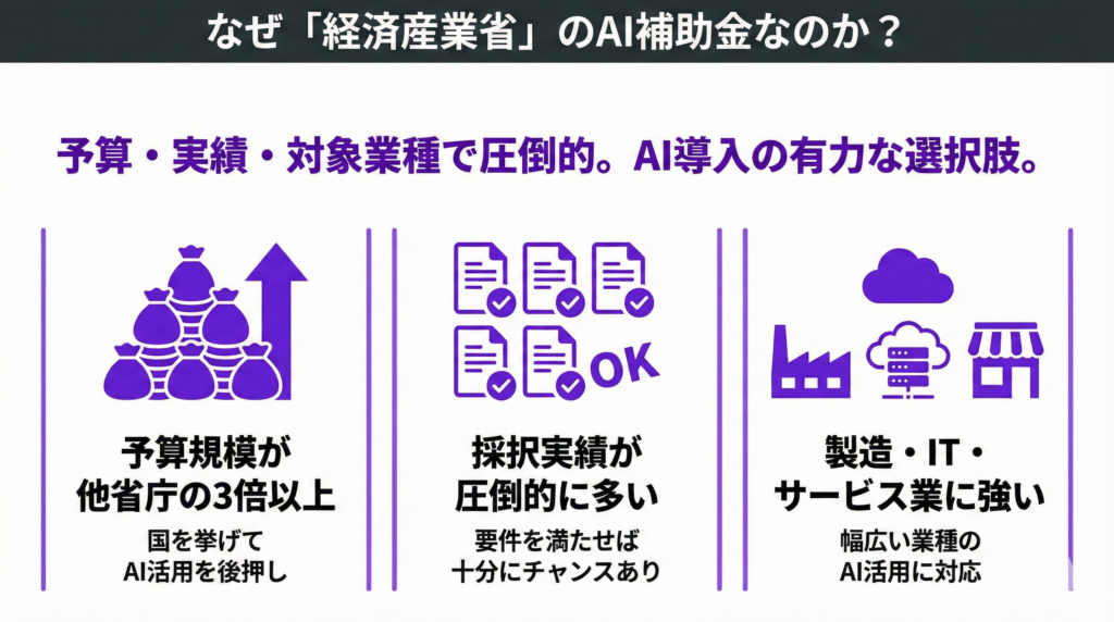AI導入に使える補助金は、経済産業省だけでなく、総務省や農林水産省など複数の省庁が用意しています。では、なぜ経済産業省の補助金が特に注目されているのでしょうか。その理由は大きく3つあります。