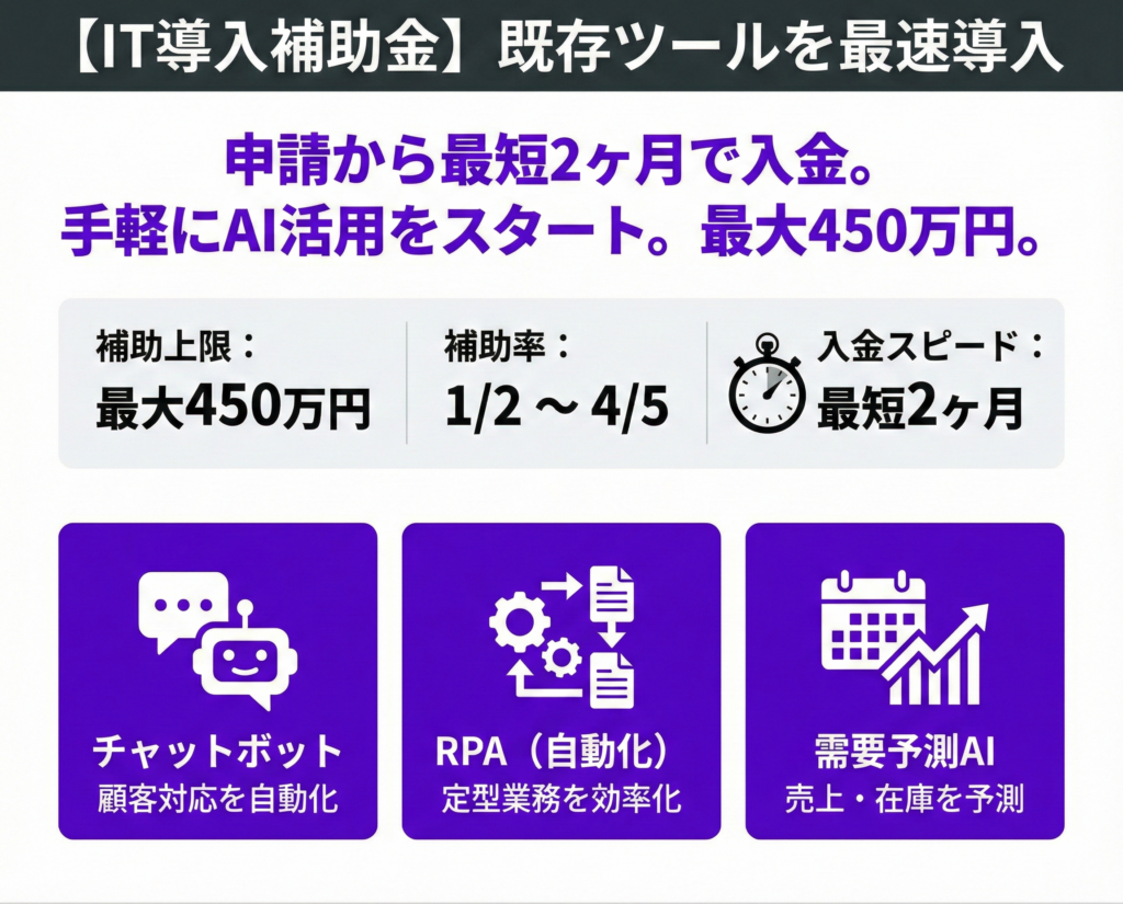 「できるだけ早くAIを導入したい」「大規模なシステム開発ではなく、既存のAIツールを使いたい」。そんなニーズに応えるのがIT導入補助金です。