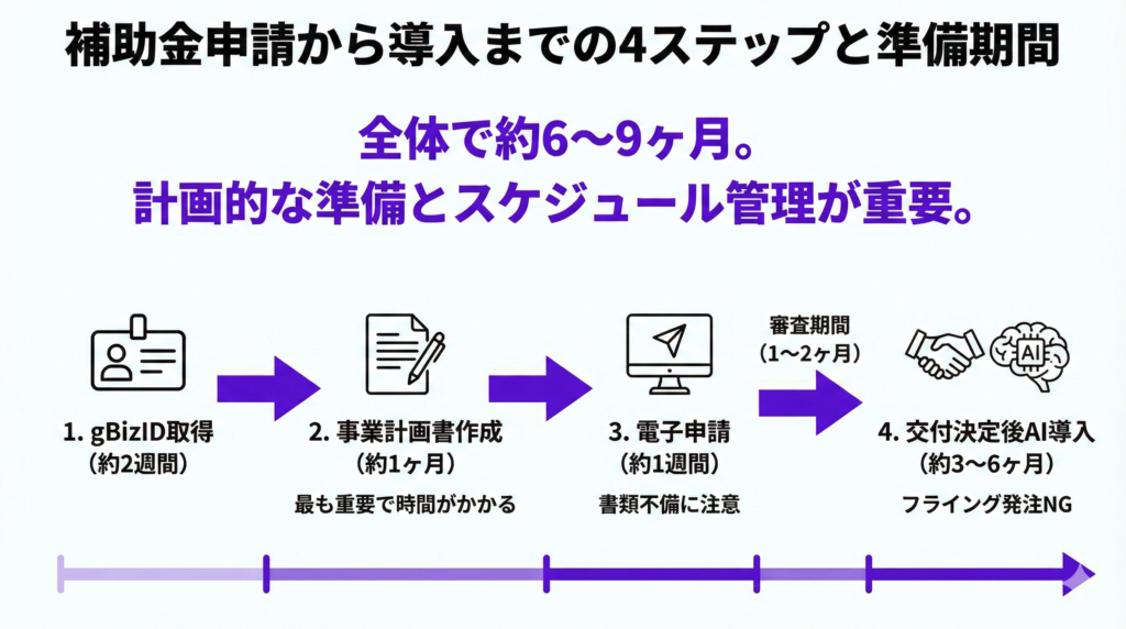 しかし、手順を理解して計画的に進めれば、補助金申請は決して難しいものではありません。ここでは、申請から導入完了までの流れを4つのステップで解説します。