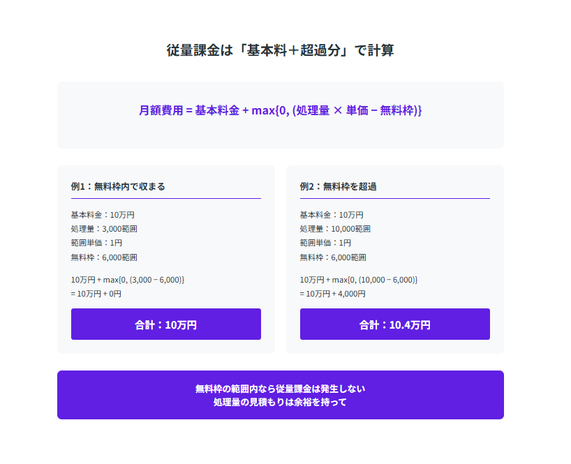 基本料金とは別に、処理した分だけ従量課金が発生する方式です。無料枠がない代わりに、基本料金が低めに設定されているケースが多い傾向です。