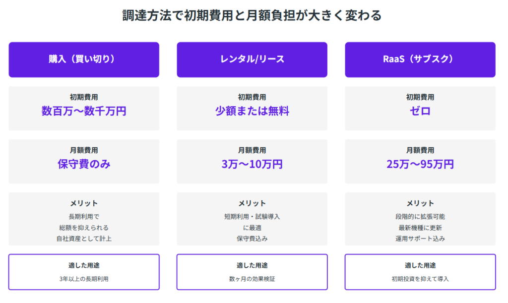 本体価格だけでなく、周辺機器の費用、設置工事、システム連携、保守費用など、見えにくいコストが積み重なって総額が膨らむケースも少なくありません。さらに購入とレンタル、最近注目されているサブスクリプション型(RaaS)では、初期投資と月額コストのバランスが全く異なります。