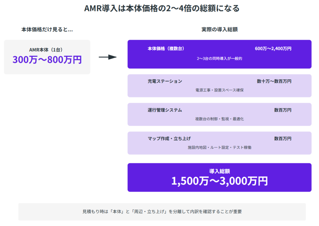 購入は総額数百万〜数千万円(AMR複数台で1,500万〜3,000万円級)