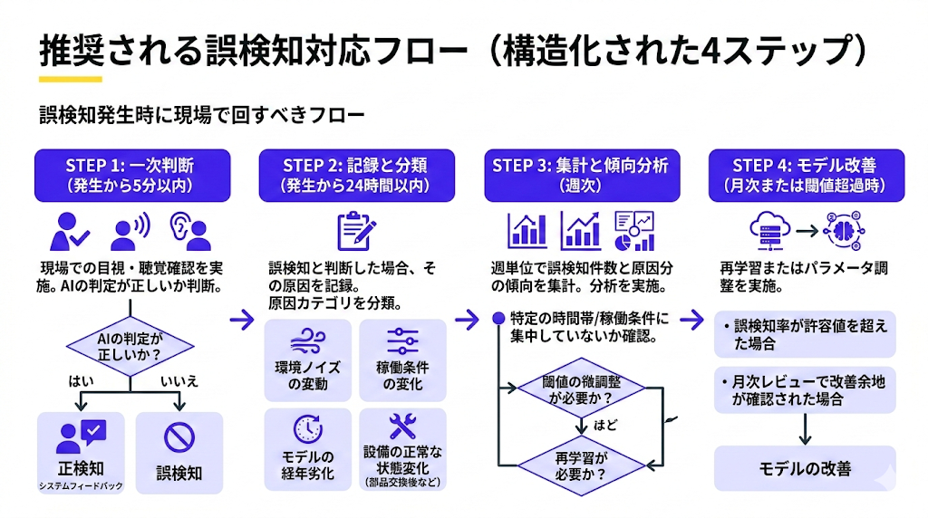 誤検知が発生した際に現場で回すべきフローは、以下の4ステップで構造化しておくことを推奨します。