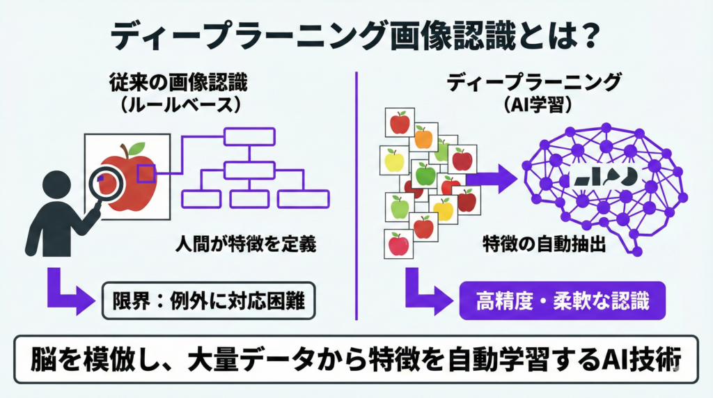 従来の画像認識では「ここに注目しなさい」と人間がルールを細かく設定する必要がありましたが、ディープラーニングではAI自身がデータから学習するため、より柔軟で高精度な認識を実現できます。