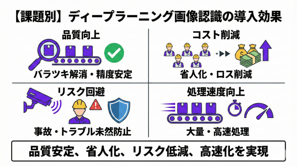ここでは、ディープラーニング画像認識がもたらす効果を、ビジネス上の課題別に整理して解説します。