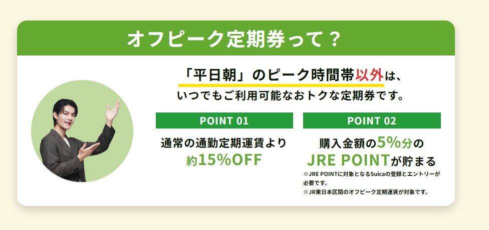 JR東日本が2023年3月に導入した「オフピーク定期券」は、通勤ピークの混雑緩和を目的とした画期的な取り組み。平日朝のピーク時間帯(概ね7時〜9時30分)以外であれば使用でき、通常の定期券より約15%安価に設定されています。