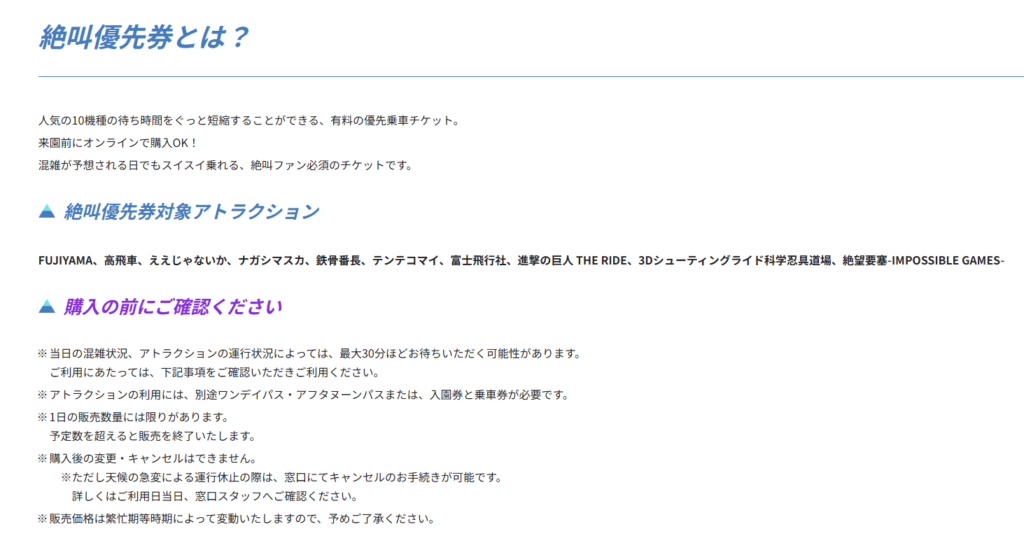 アフターオンラインフリーパス等に「ダイナミックプライシング」導入(2022年)を公表。加えて絶叫優先券の販売価格は時期(繁忙期等)により変動と案内