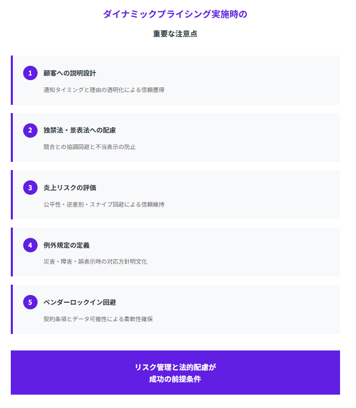 ダイナミックプライシングの成功には、技術的な実装だけでなく、リスク管理が不可欠。以下の5つの注意点を事前に検討することで、炎上リスクや法的問題を回避できます。