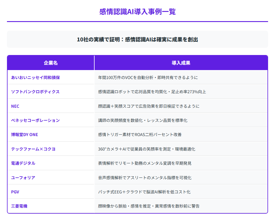 本記事では、日本企業による感情認識AIの具体的な導入事例を5つの軸に分けて詳しく紹介します。