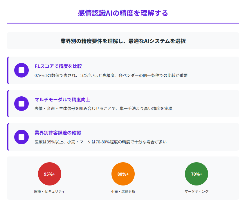 感情認識AIの導入を検討する際、最も重要な要素の一つが精度です。技術の信頼性を正しく評価するためのポイントをご紹介します。