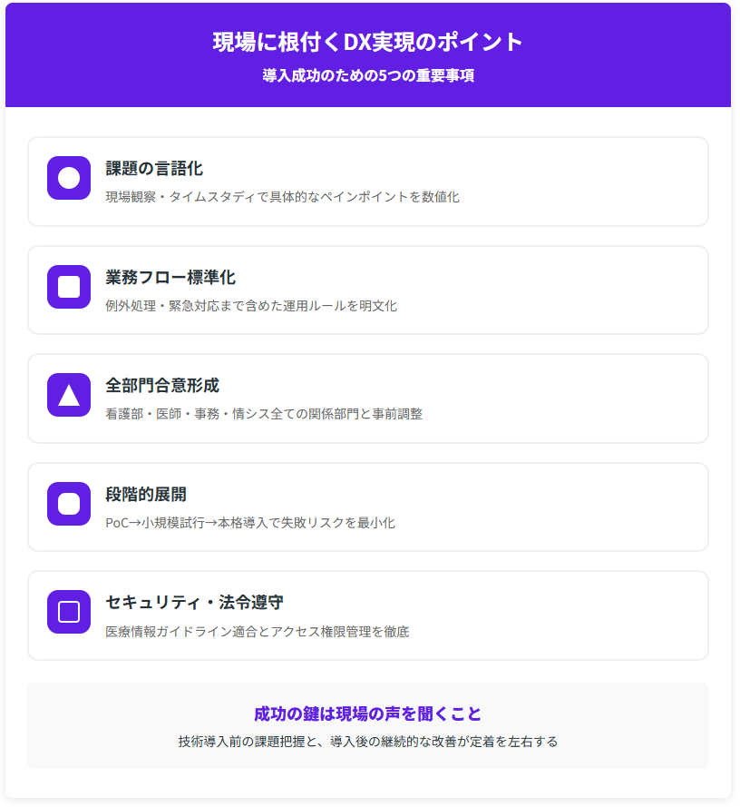 看護DXの成功は、優れたシステムを導入するだけでは達成できません。現場のスタッフが日常業務の中で自然に活用し、継続的に効果を生み出せる環境を構築することが重要です。以下では、現場に根付くDXを実現するための5つの重要なポイントをご紹介します。