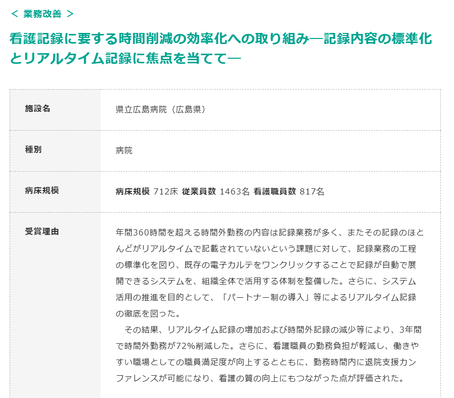 - 県立広島病院:記録内容の標準化とリアルタイム記録で時間外勤務を72%削減