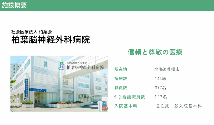 | 企業名 | 社会医療法人柏葉会 柏葉脳神経外科病院(144床) |