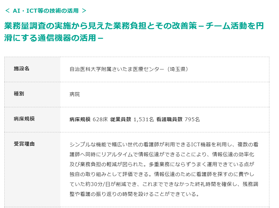 - 自治医科大学附属さいたま医療センター:通信機器活用で情報伝達にかかる30分/日を削減