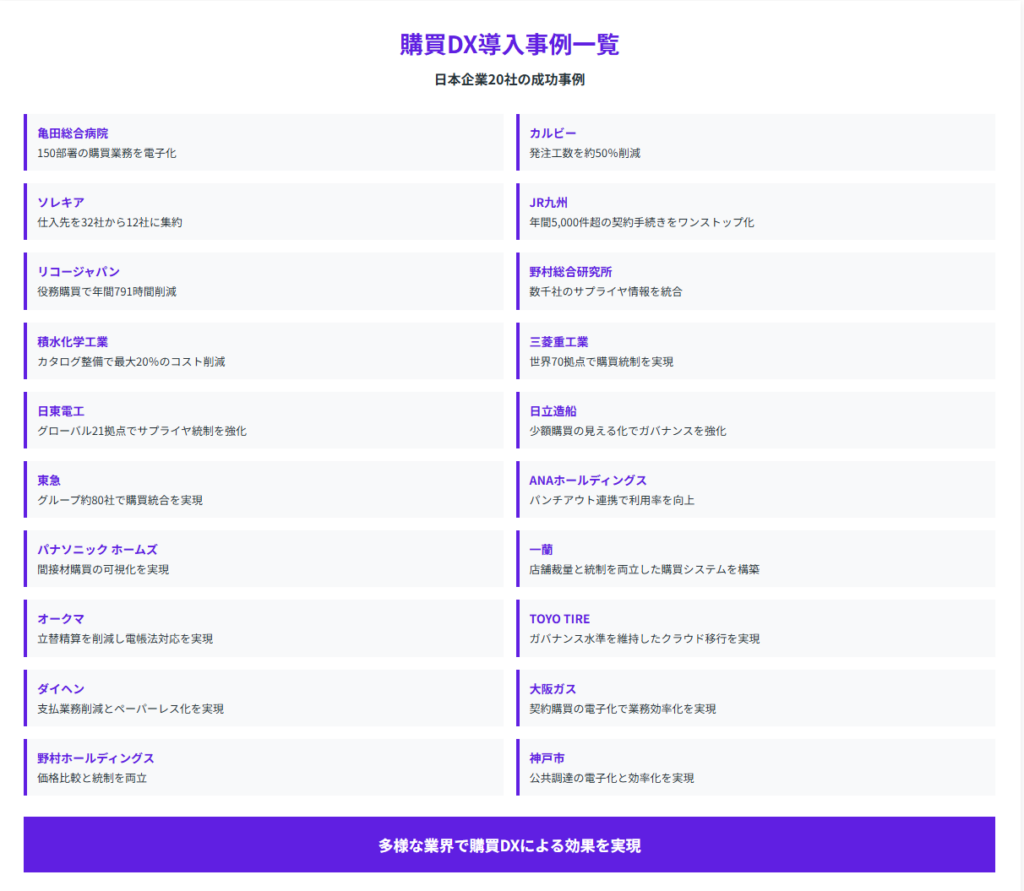 本記事では、日本企業20社の実際の購買DX導入事例を、目的別の軸に沿って詳しく紹介します。各事例では具体的な導入効果やKPI、成功のポイントまで含めて解説しており、購買業務の改善を検討している方にとって実践的な参考資料となるでしょう。