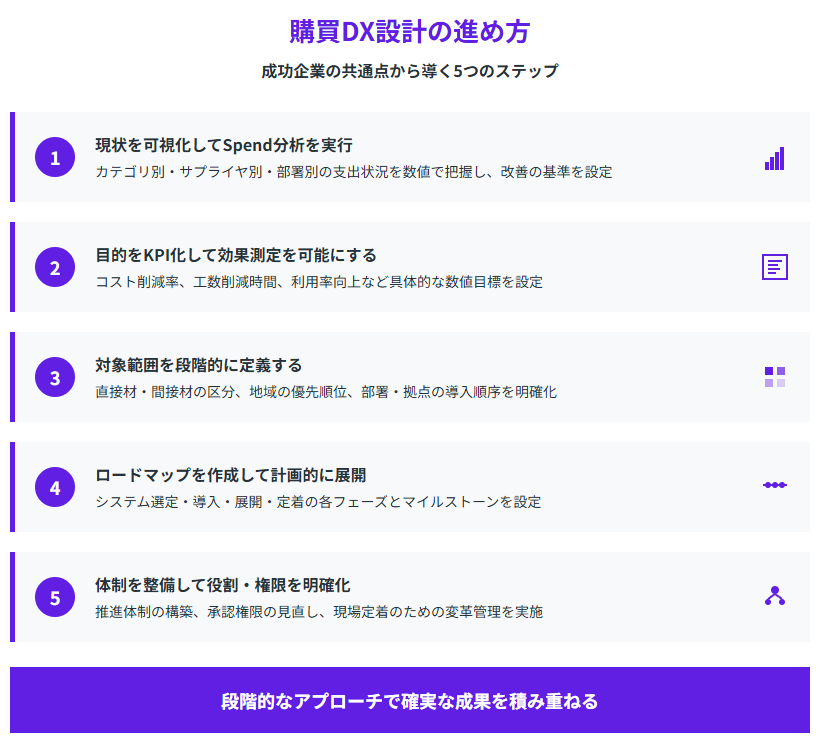 事例を参考にして購買DXを検討する際、実際の設計プロセスで押さえるべきポイントがあります。成功企業の共通点から導き出される、効果的なアプローチ方法を解説します。