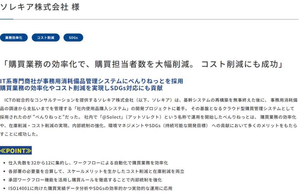 | アフター | クラウド購買「べんりねっと」で電子発注・承認、複数サプライヤ連携。用度課の人的負担を大幅軽減、現場の再発注も容易化。集中購買でコスト圧縮を推進 |