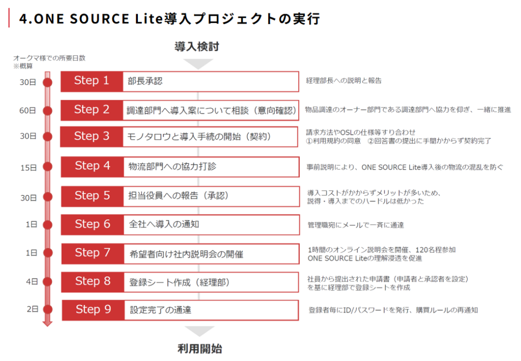 | アフター | ONE SOURCE Liteで全社導入。データが残る/現場直送で運用負荷を軽減。価格比較の検証でコストメリットを確認、対象品の約9割をカバー |