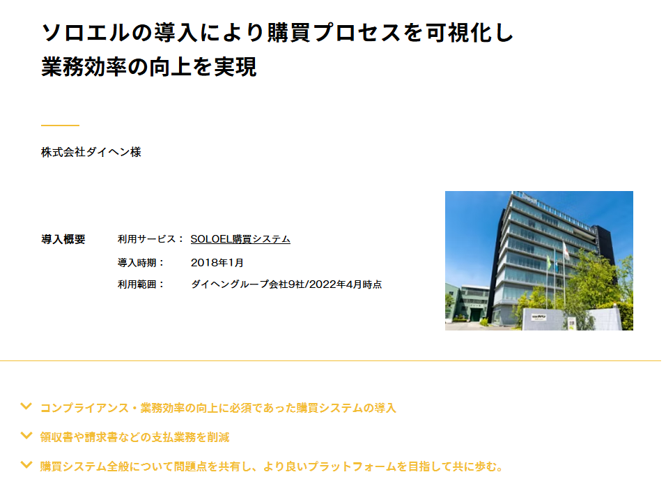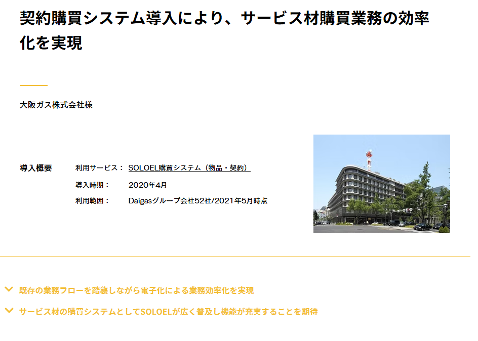 | アフター | SOLOEL(物品・契約)を採用し、既存フローを踏襲しつつ電子化。グループ52社へ展開(2021/05) |