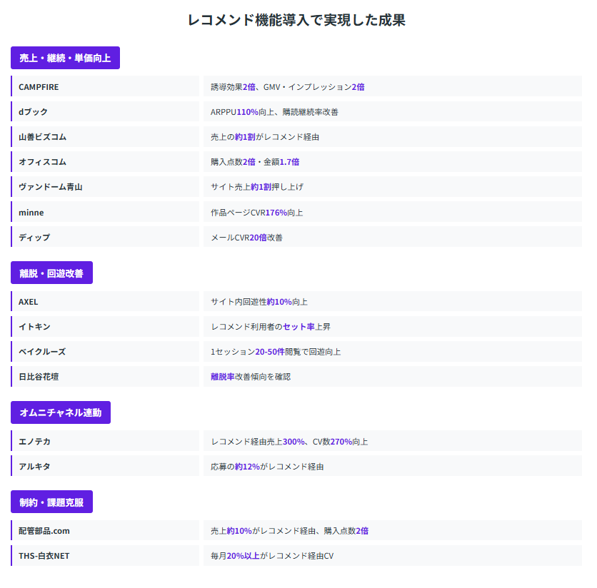 レコメンド機能の効果測定では、CVR(コンバージョン率)、AOV(平均注文単価)、LTV(顧客生涯価値)、継続率、返品率など複数の指標が関連します。成功事例を見ると、CAMPFIREでは「誘導効果2倍」、オフィスコムでは「購入点数2倍・金額1.7倍」など、企業ごとに重視するKPIが異なっていることが分かります。