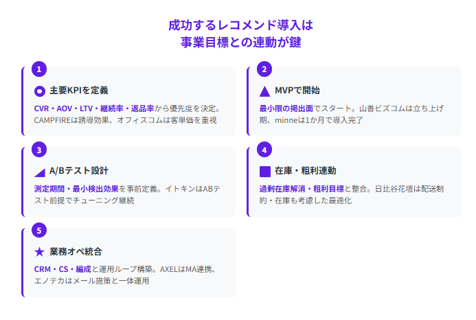 レコメンド機能を導入する際、自社の事業目標に直結するKPI設計が成功の鍵となります。以下の5つのポイントを順序立てて検討することで、効果的なレコメンドシステムを構築できます。