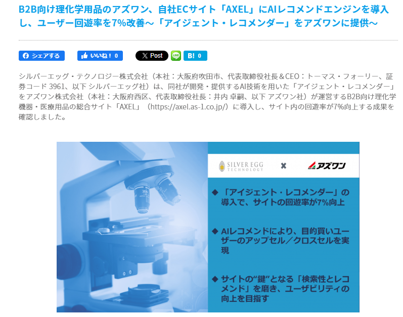 理化学・医療・産業機器の専門商社アズワンが運営するB2B ECサイト「AXEL」では、紙カタログ由来の膨大な商品点数(900万点超)により、ユーザーの目的買い傾向が強く、サイト内での回遊創出が重要な課題となっていました。検索だけでは直帰率の改善に限界がありました。