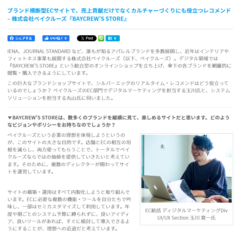 ブランド横断型ECサイトで、売上貢献だけでなくカルチャーづくりにも役立つレコメンド – 株式会社ベイクルーズ『BAYCREW’S STORE』 | SILVER EGG TECHNOLOGY