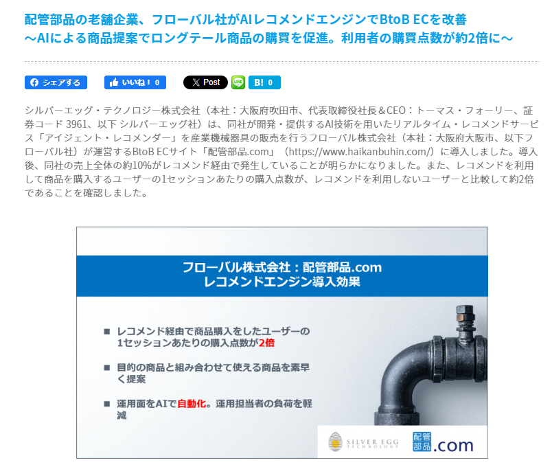 フローバルの配管部品.comが売上の約10%をレコメンド経由で実現した事例