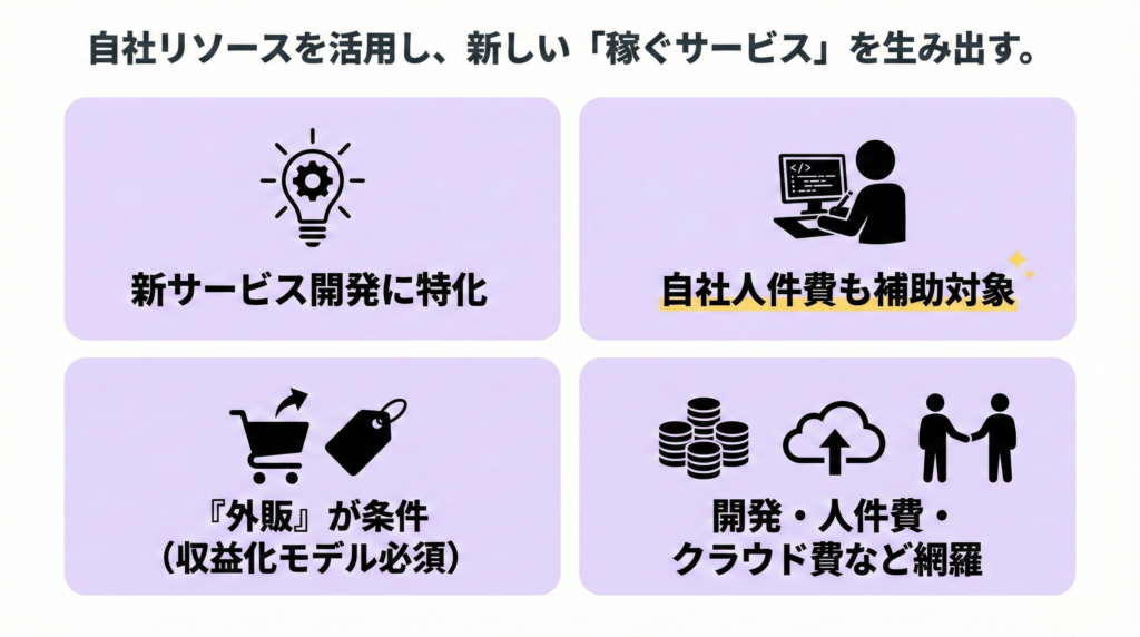 前述の「革新的事業展開設備投資支援事業」が設備の購入を対象としているのに対し、こちらは「サービス開発」そのものに焦点を当てている点が大きな違い。
