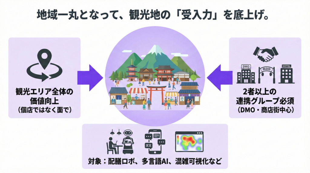 対象となるのは、観光客が多く訪れる商店街、温泉街、観光スポット周辺エリアなど。1つの店舗や施設だけでなく、エリア内の複数事業者が協力して取り組むプロジェクトに補助金が交付されます。