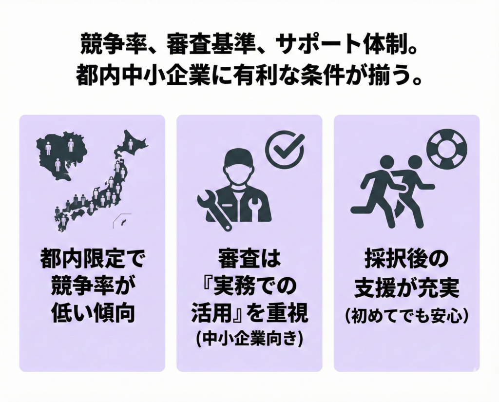 • 都内企業限定のため、全国規模の国の補助金に比べて競合が少ない